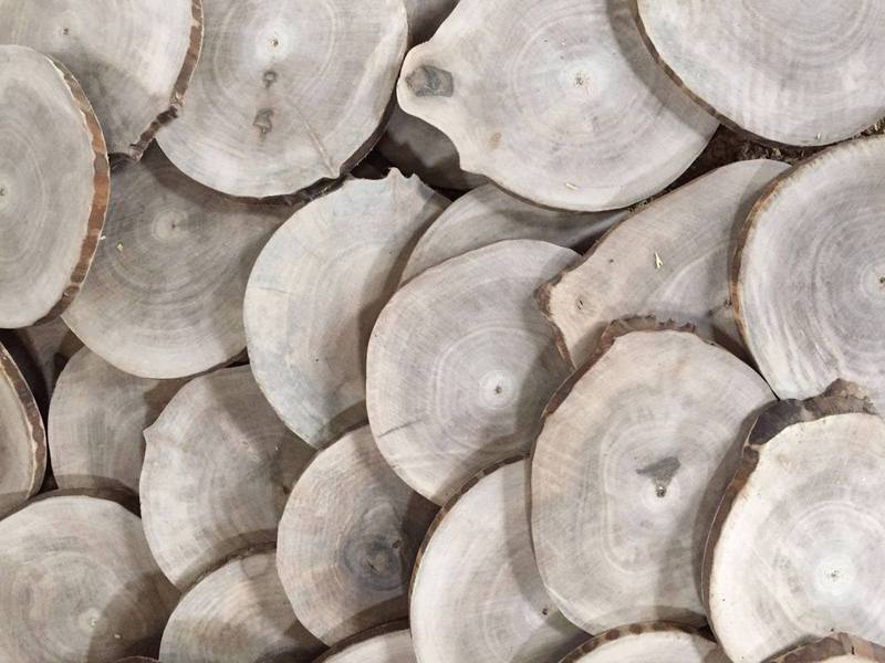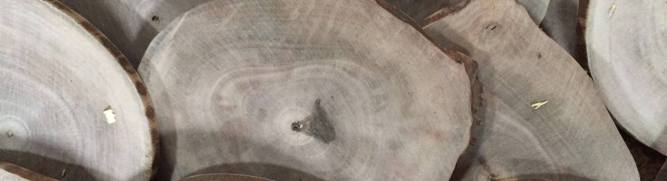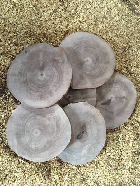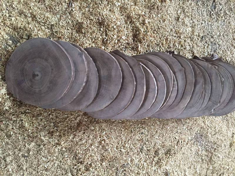 Rodajas de Nogal procedente de nuestras plantaciones gestionadas de forma sostenible. Los árboles llevan más de un año cortados y se almacenan los troncos hasta que se secan y se estabilicen. Luego se hacen rodajas de 1 cm de grosor y diámetro de 12-13 cm y se lijan por una cara. No llevan corteza.