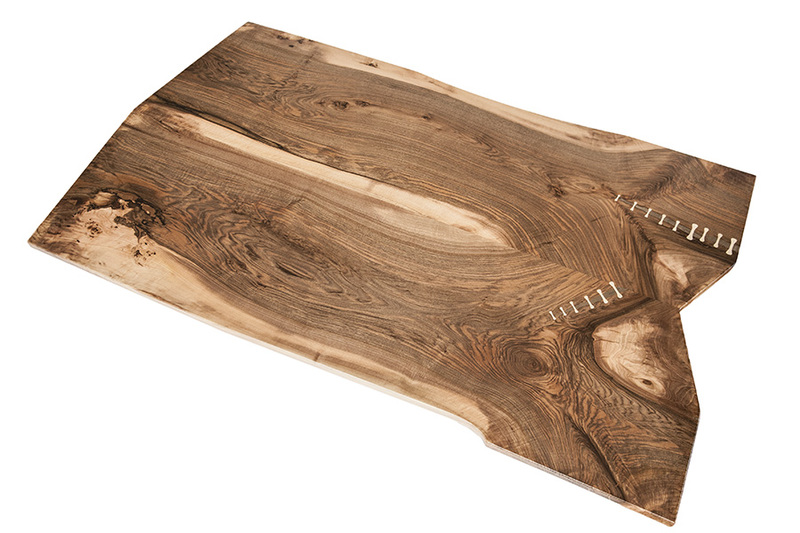 Mesa de comedor de madera maciza de nogal español, compuesta por dos grandes tablones unidos en forma de libro. La decoración incluye grietas rellenas con masilla procedente de polvo de lijado del mismo tablón y estabilizadas con “grapas de milano” de nogal blanco joven. Está terminada en barniz extraduro e incluye patas de acero pulido.