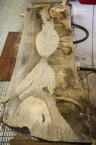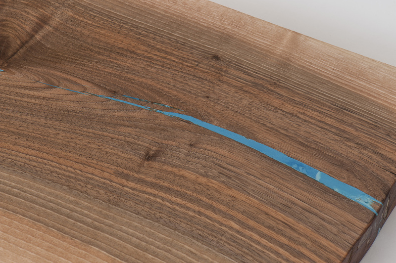 Mesa de café de nogal español compuesta por un sólo tablón de palma (zona de inserción de las ramas con el tronco). Tiene grietas rellenas de piedra semipreciosa (malaquita verde) y está terminada con cera y aceite dado a muñequilla. Incluye patas en blanco y lacadas al horno. Medidas y peso: Largo: 140 cm Ancho: 70 cm Grosor: 4,2 cm Peso: 30 kg.